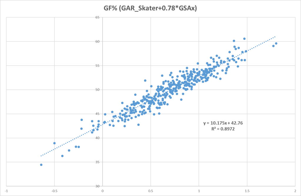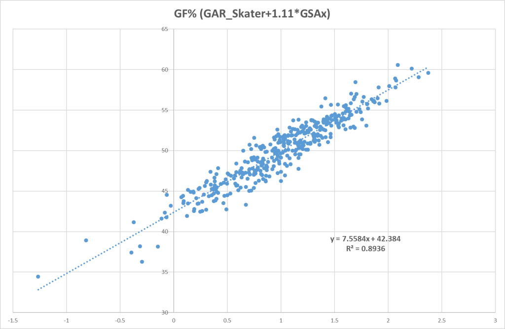 The next step is to add the goalies impact. I could use Team GAR Goalie, but it turns out that goals saved above expected (GSAx) works better. By refining the graph, I found that if you multiply GSAx with 1.11, you will get the best result. Here’s the graph: