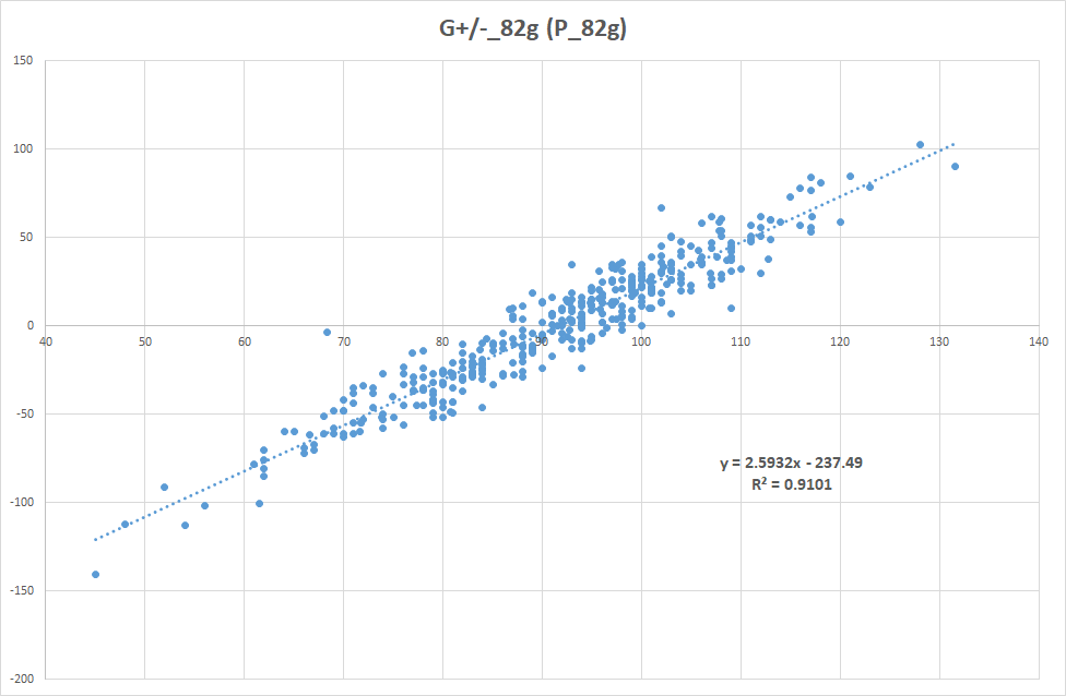 Again I’m using team data, so that I can see how well it correlates GF%. So how well does goal differential and standings points actually correlate. Here’s G+/- as a function of points. I have used 82 game pace – otherwise the shortened season and this one would skew the results.