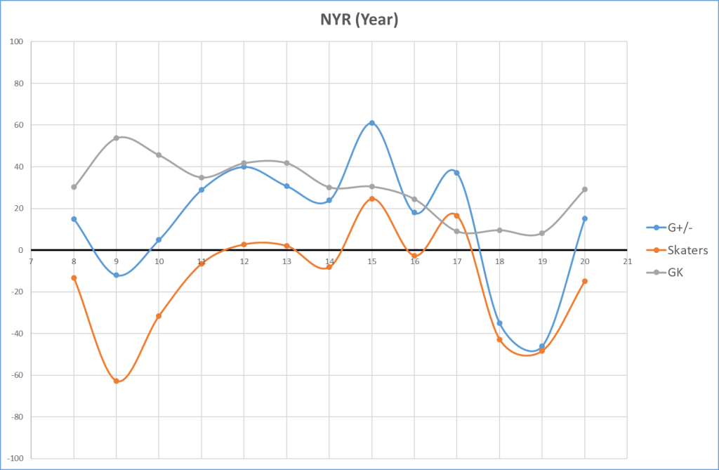 | NYR | 24.85 | 19.32 | -25.68 | 6.66 | -12.01 | -1.03 | 12.11 | 13 |