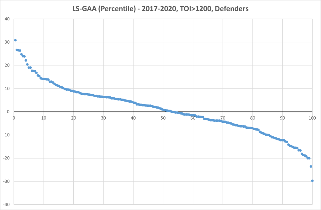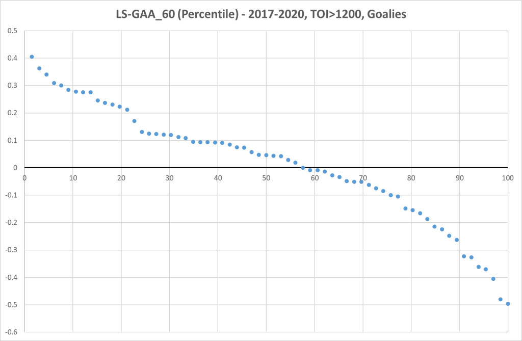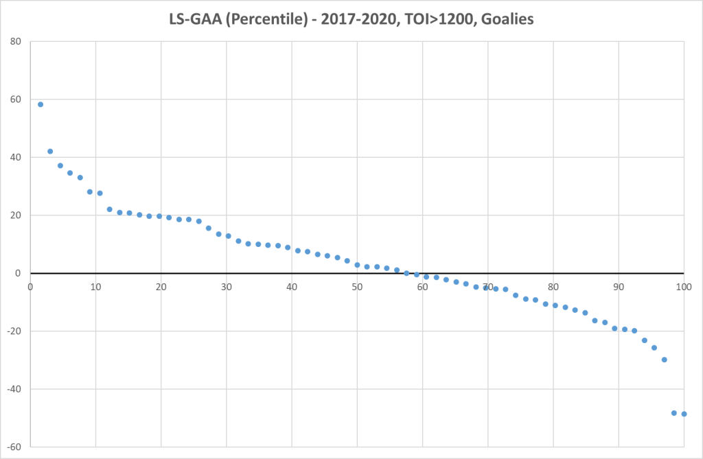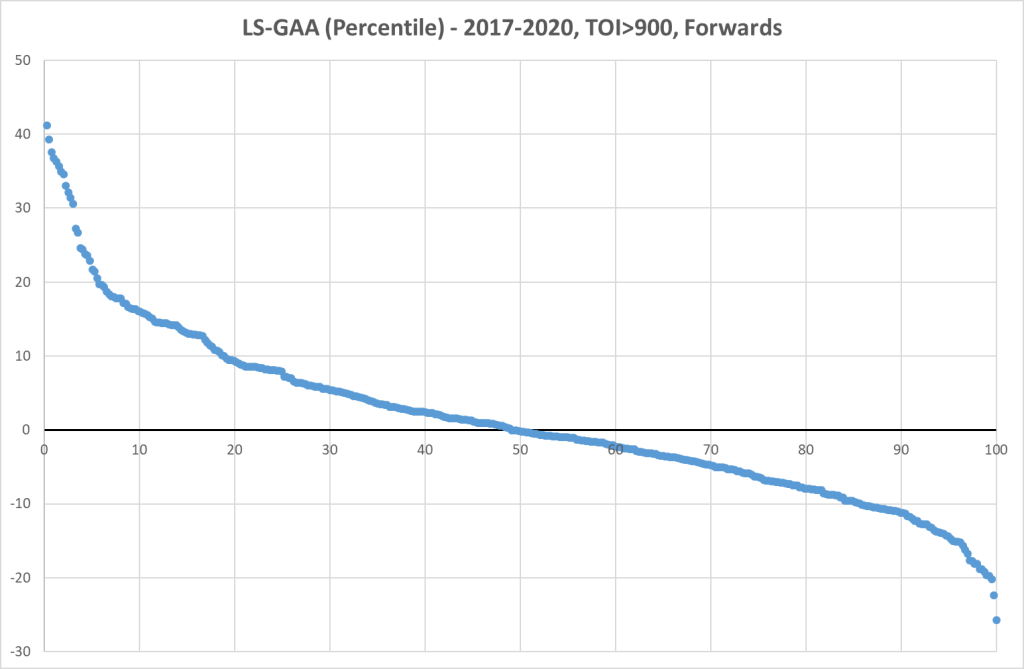 In the midst of writing a blog about player projections, I came to realize a much smarter way to graphically show my points from the previous blog. Instead of tiers, I’m simply drawing LS-GAA as a function of percentile. I’m using the same data as I did in the last blog, so I’m looking at a 3 year time frame from the season 2017/2018 to the season 2019/2020.
