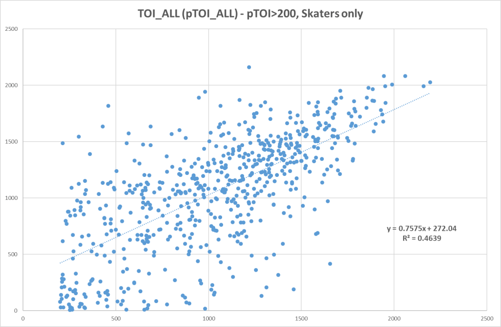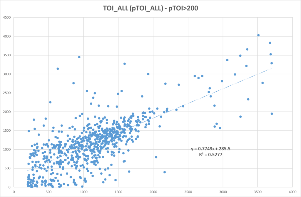 So let’s look at the correlation between projected TOI and actual TOI: