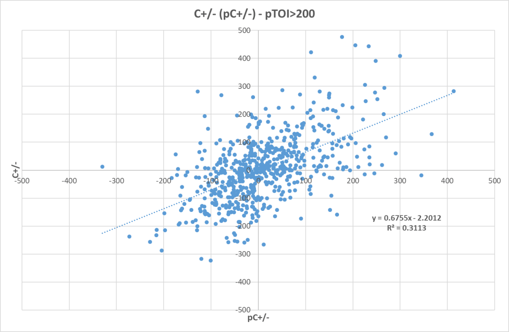 Now we see a much better predictability (R-squared = 0.311). It’s also better than it was for LS-GAA (see blog 10). This really isn’t surprising. The reasoning for using corsi instead of goals is because the sample size and repeatability are bigger. The problem with corsi is that it doesn’t correlate particularly well with goal scoring (see blog 1).