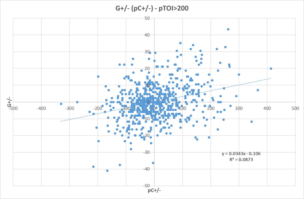 Lastly, I have also looked at how predictive corsi differential and expected goal differential are of actual goal differential. So here’s the actual on-ice goal differential as a function of projected corsi differential: