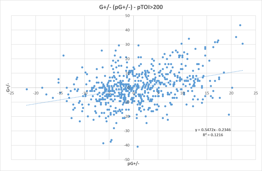 Let’s start by looking at on-ice goals. Here’s how the projected on-ice goal differential correlates with the actual on-ice goal differential: