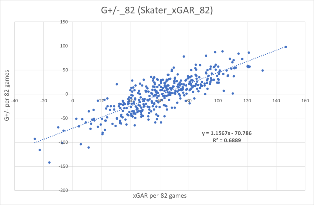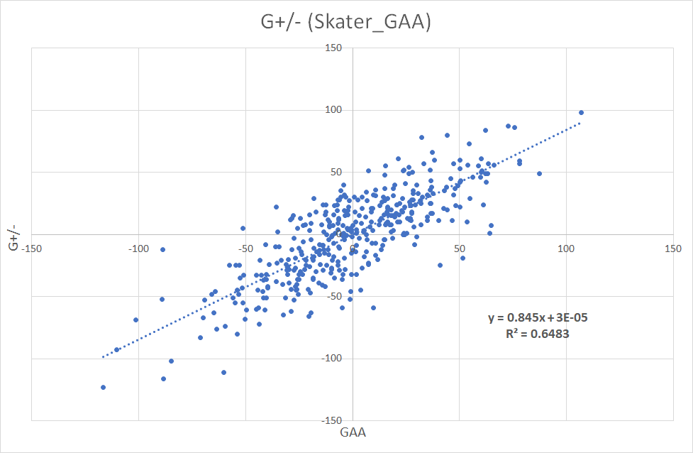 We see that Skater_GAA and Skater_xGAA correlates similarly well with goal differential as Skater_GAR_82 and Skater_xGAR_82 did. This isn’t surprising since the changes I’ve made primarily affects forwards vs defenders and PP specialists vs PK specialists, so as long as every team plays 3 forwards and 2 defenders 5v5, you wouldn’t expect a big difference.