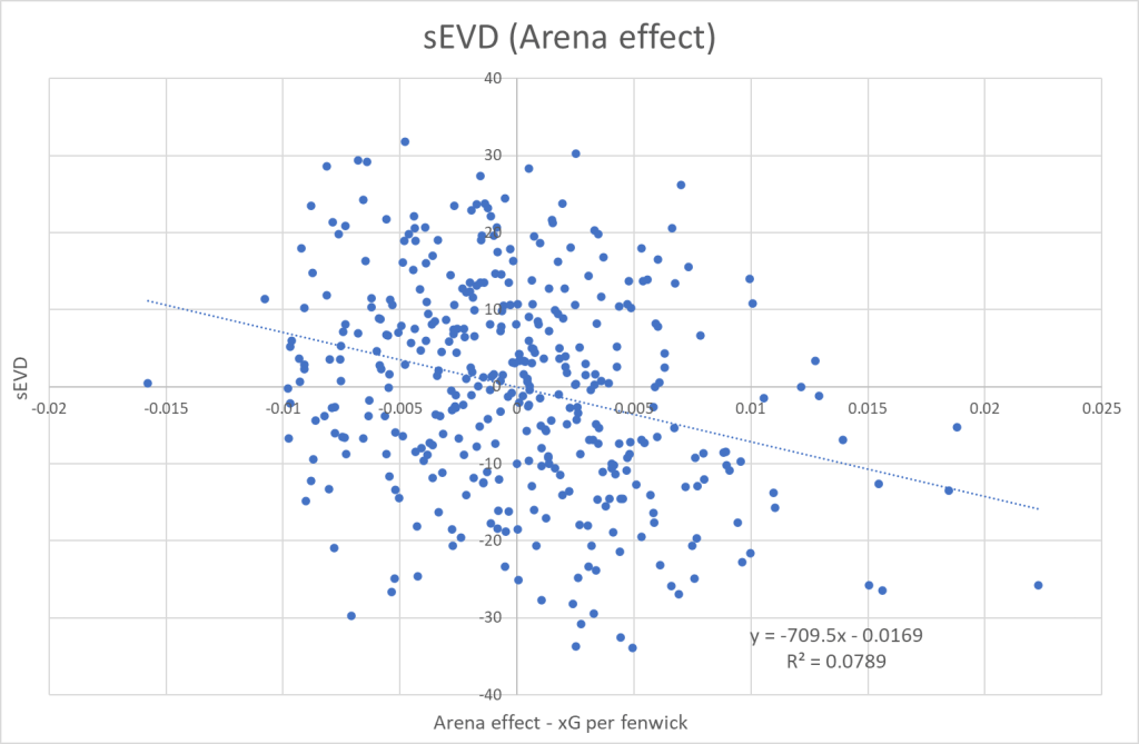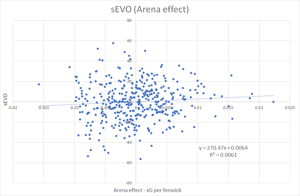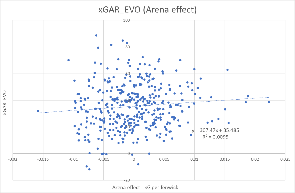 So, there’s no correlation between the two at the team level. Theoretically, Arena effects could still impact the GAR_EVO of certain type of players, but at the team level there appear to be no impact.