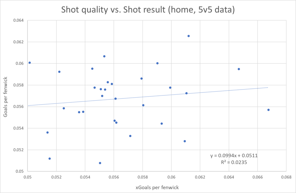 You would expect some correlation between Shot quality and goalscoring, so if the Shot quality is higher at certain arenas, you would expect the goalscoring to be higher as well. To test this, I’ve defined Shot result (SR) as goals per fenwick.