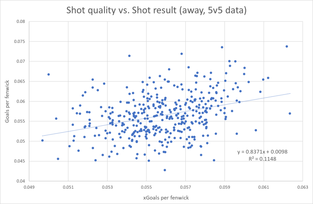 Let’s now look at the correlation at home versus on the road. I’m using overall Shot quality and overall Shot result, so it’s:
