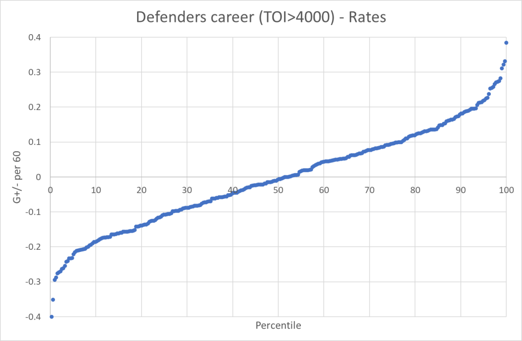 A similar analysis can be done for the defenders, so let’s start by looking at the talent distribution based on sGAA per 60: