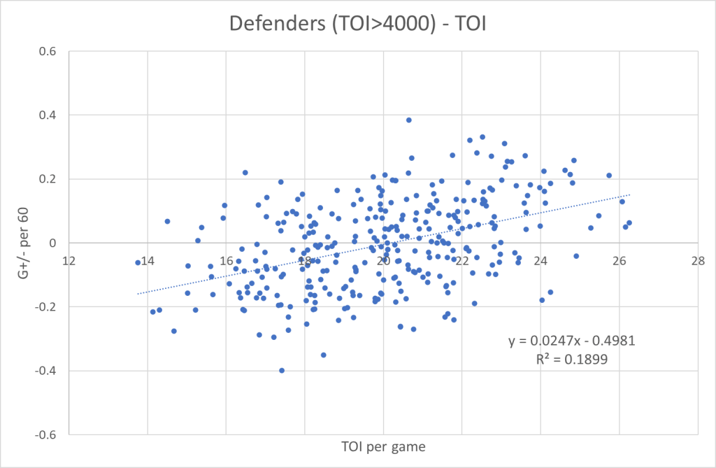 This can also be illustrated by looking at the correlation between TOI per game and sGAA per 60: