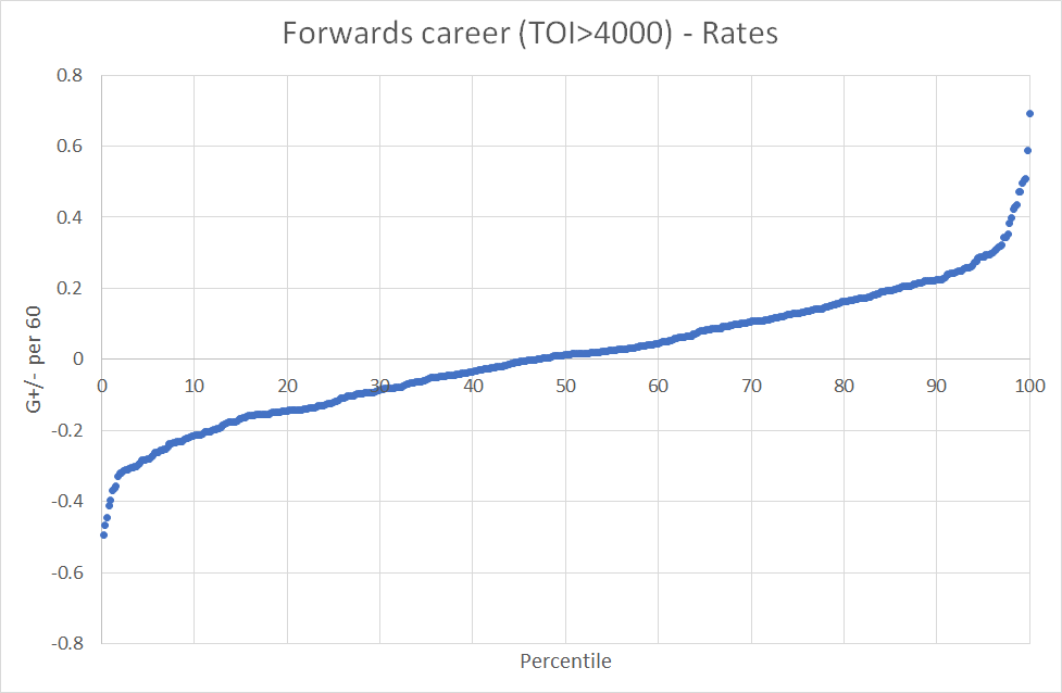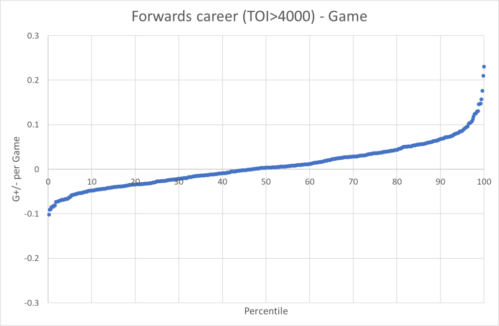 Now, we see the bad players have less impact while the good players have more impact. This is because coaches are pretty good at evaluating forwards, so the good forwards play a lot, while the bad forwards have limited roles – As it should be.