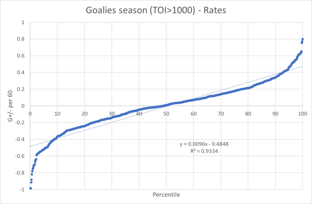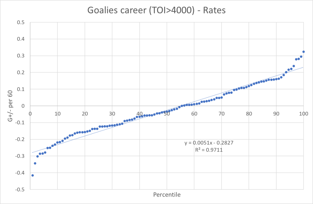 Finally, we get to look at the goaltenders. The worst nightmare of every statistician. The approach is the same as before. We start by looking at career rates: