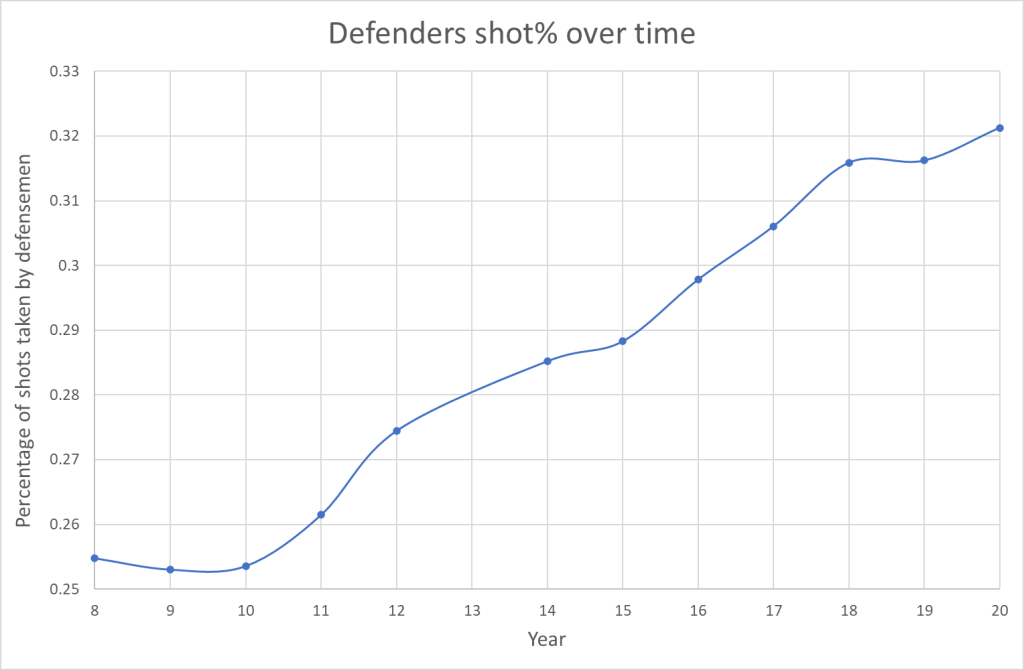 The next graph shows just that. How big a percentage of shots are taken by defenders leaguewide over time?