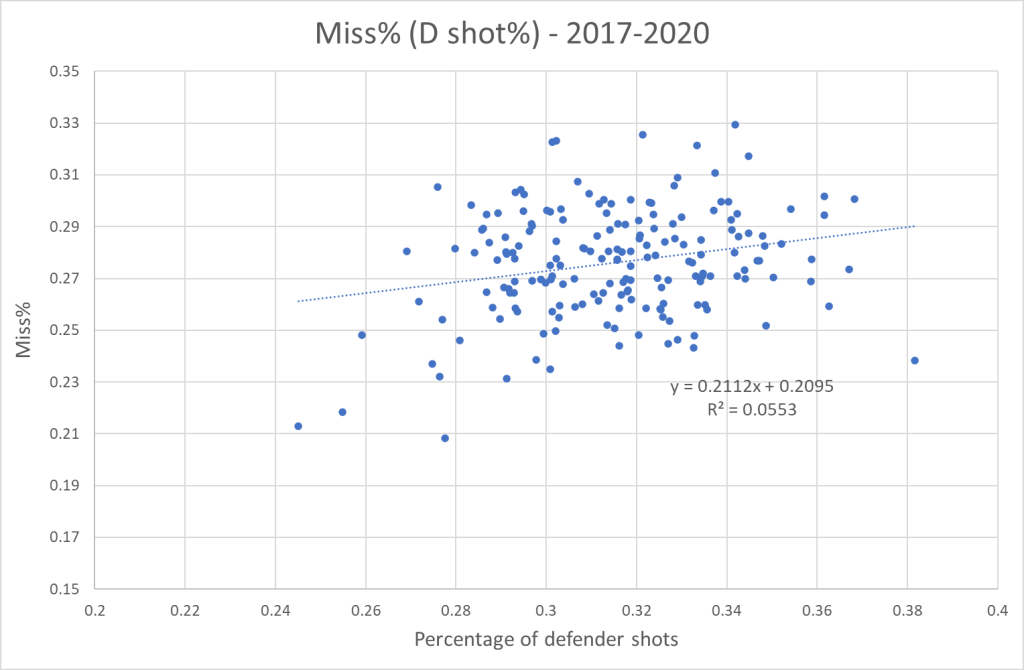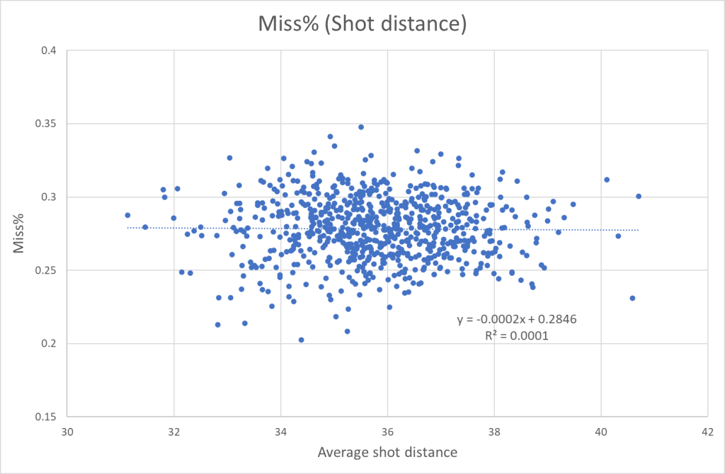 Before we can talk about responsibility, we need to determine if shot misses is a completely random occurrence. If shot misses are random, we should see the miss% regress towards league average with a big enough sample size.