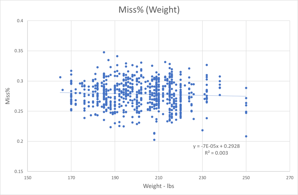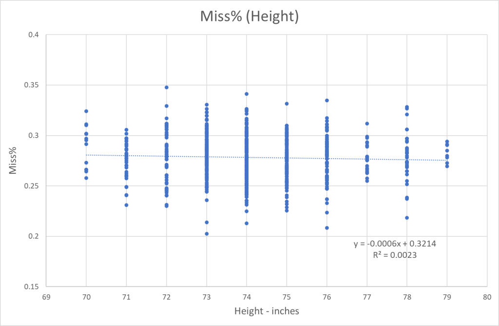 If quality doesn’t correlate with shot misses, another possible explanation could be the size of the goaltender. Here’s the miss% as a function of height and weight: