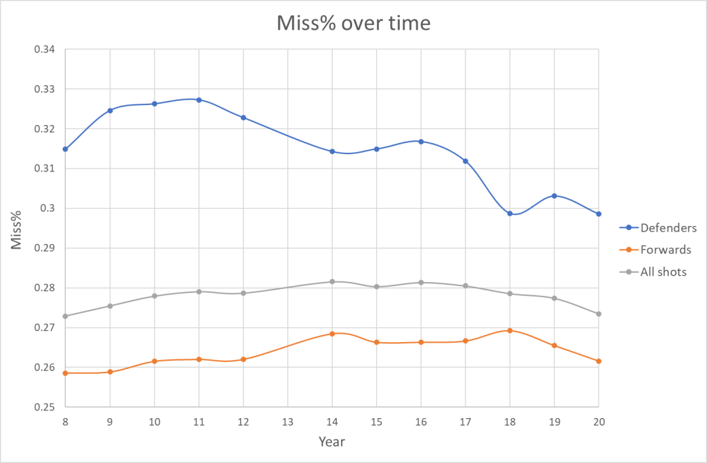 We see two interesting trends here. First of all, defenders generally miss the net more often forwards, and secondly defenders seem to be missing the net less and less.