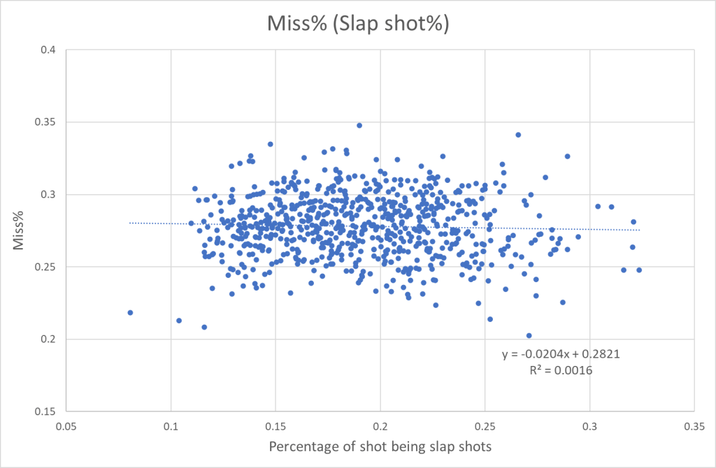 The last thing I looked at was shot type. Previously, we saw that slap shots missed the net more often than wrist shots and snap shots, so maybe there’s a connection between slap shot% and miss%: