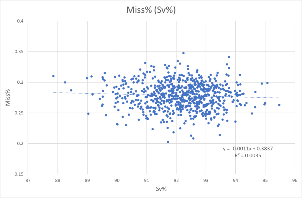 Again, we see a slight inverse correlation, but we can definitely conclude that the better goaltenders don’t face more shot misses. The inverse correlation could have something to do with saved misses. If a goaltender saves a lot of shots, that would have otherwise been misses, then the miss% decreases and the Sv%/dSv% increases.