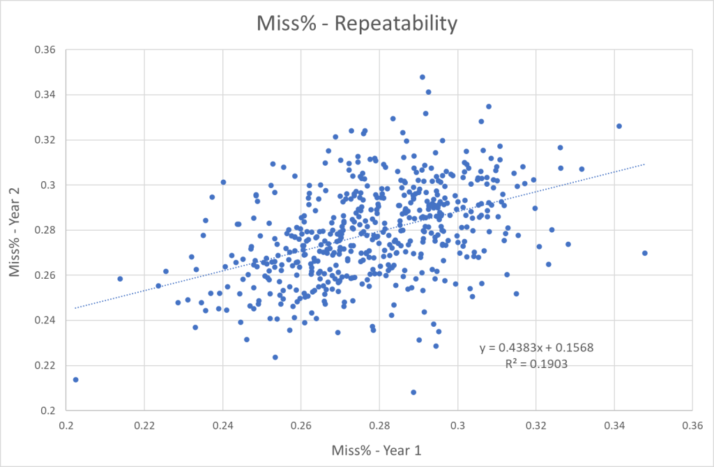 I have also compared the repeatability of miss%(for) and miss%(against). The following graph shows the correlation between miss%(for) in one year compared to miss%(for) the next year.