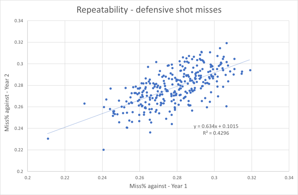 It clearly shows that miss% is somewhat repeatable from year to year. In other words, shot misses are not just some random occurrences, so next step is to find out who is responsible for these shot misses.