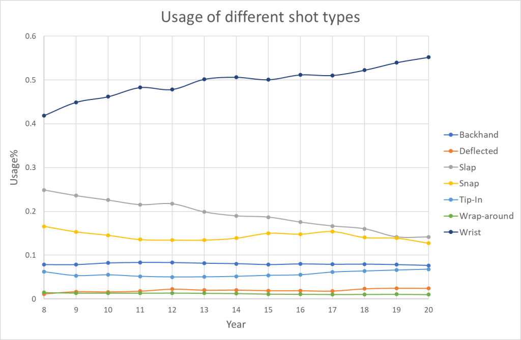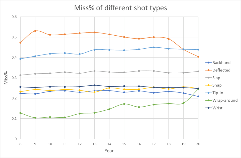 The interesting thing to take notice of here, is that slap shots are trending downwards, while wrist shots are trending upwards. This probably explains why defenders miss the net less often now. They shoot more wrist shots and less slap shots.