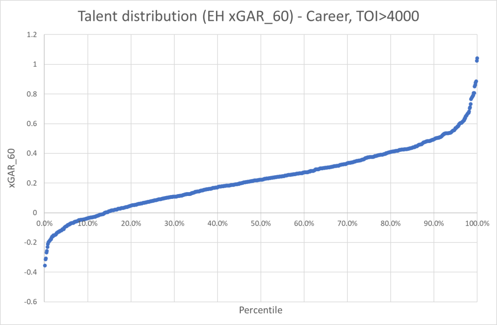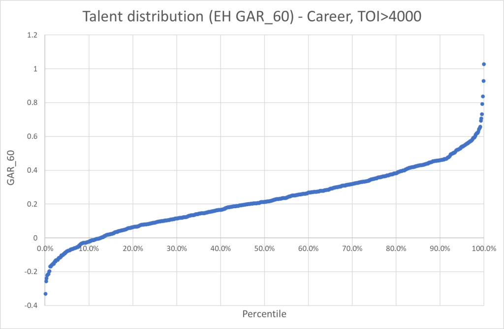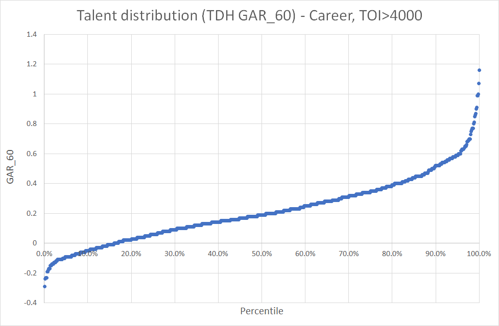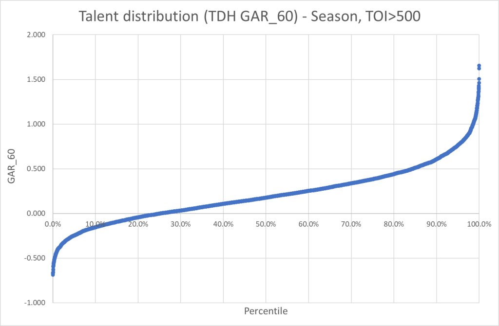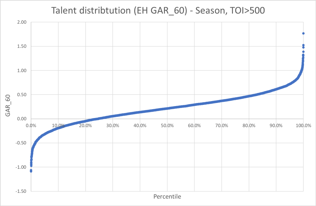 This piece will be the first in a series about talent distribution. I’ve wanted to write about this for a while, but I haven’t really had the time until now. In this article I will focus on skaters and how their “talent” is distributed across percentiles.