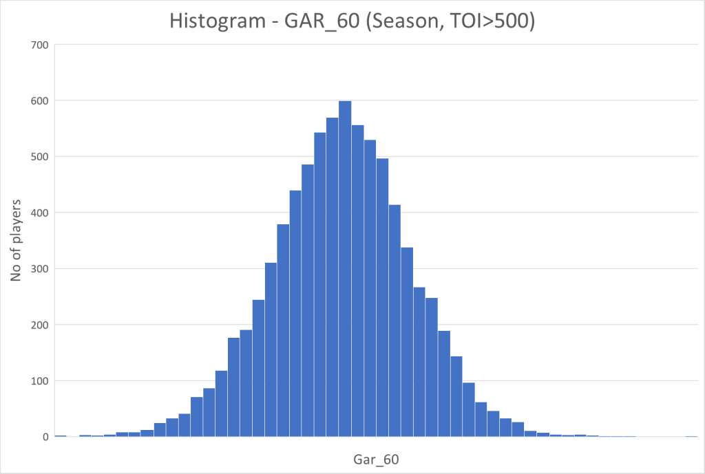 The other important conclusion to draw from the graph is that it is more or less symmetrical. This means that the negative impact per 60 of the worst players is similar to the positive impact per 60 of the very best players. This was somewhat surprising to me.