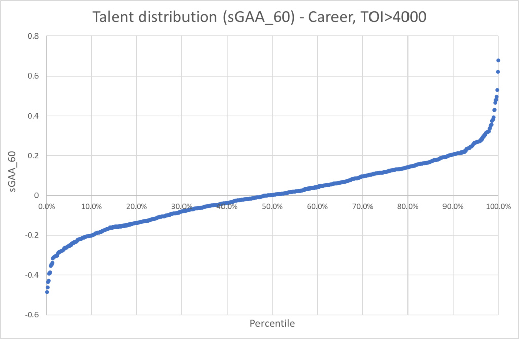Therefore, it’s worth looking at career numbers instead. Below are the graphs of the career talent as a function of percentile. The minimum TOI requirement is 4000 minutes, which gives us a dataset of around 850 skaters.