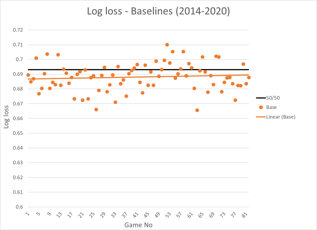 When we calculate the average log loss based on these win probabilities it comes out to 0.6881. This will be our second baseline. If we visualize the log loss as a function of game no, this is the result: