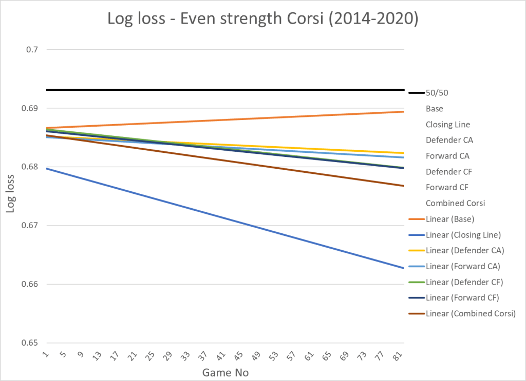 In this test I want to add each variable individually, so I can see how it impacts the log loss. I will still include the home-ice and back-to-back adjustments.