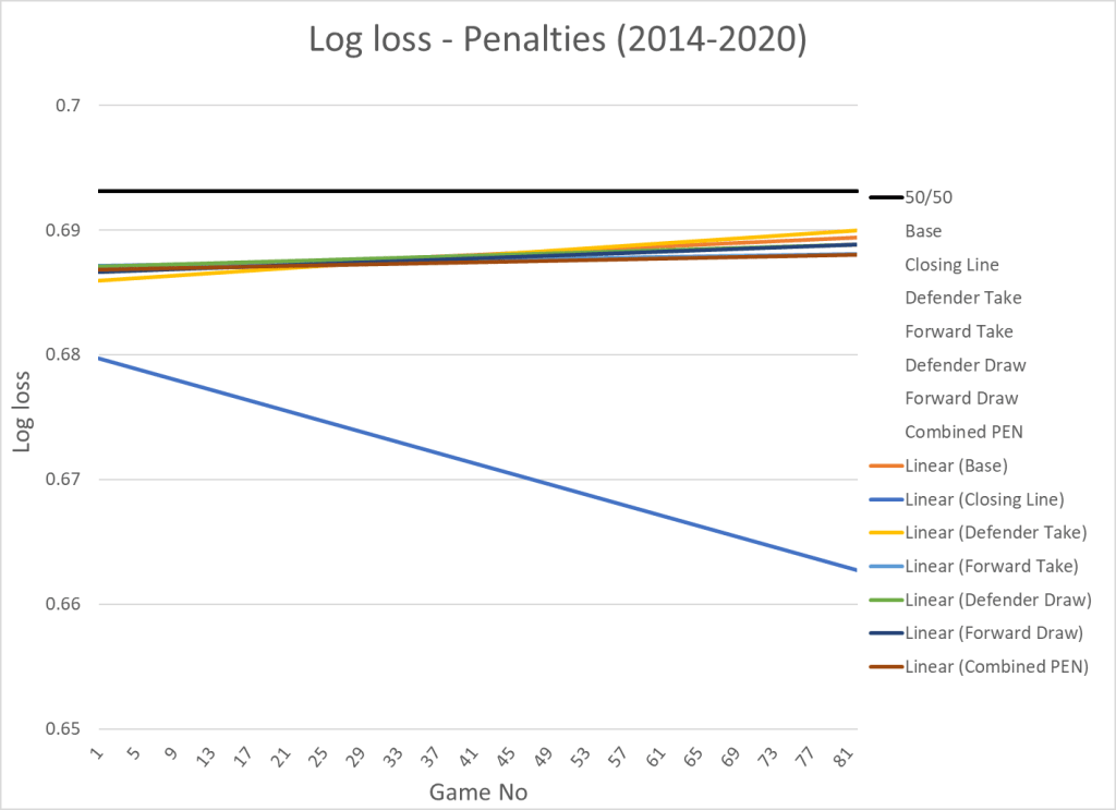 In the graph below you see how the log loss changes as the seasons progress. I’m just showing the trendlines to make the graph easier to overview.