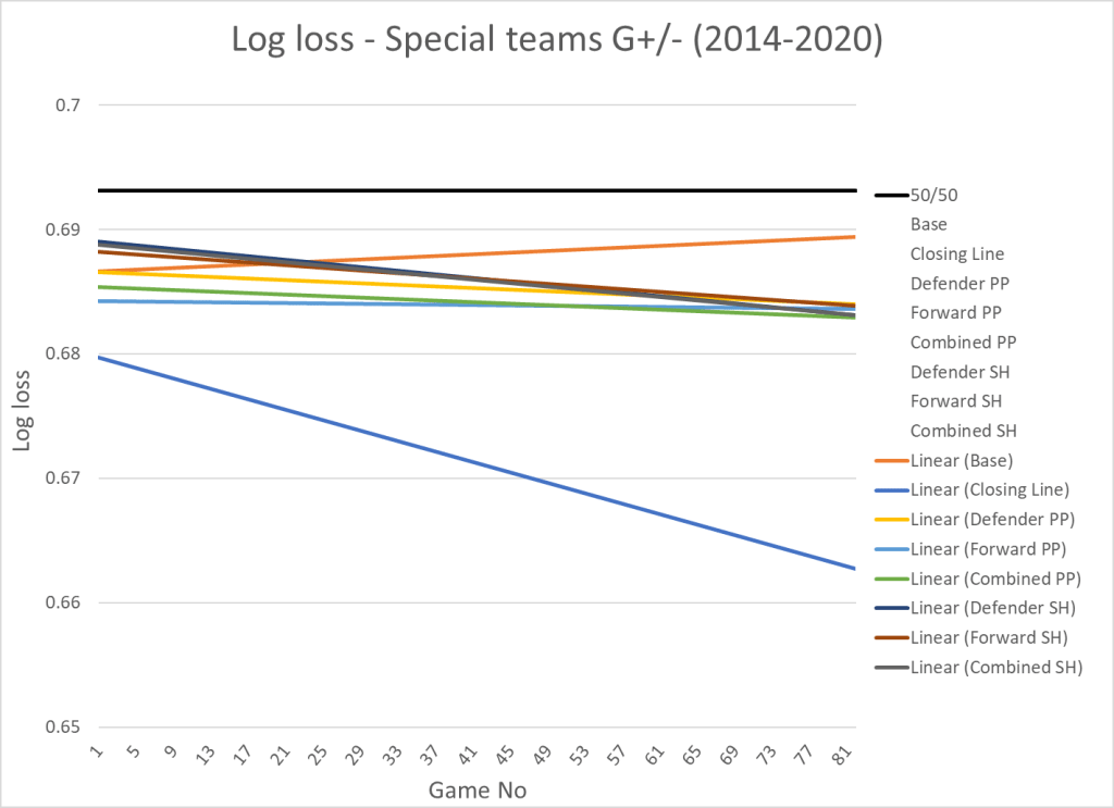Obviously, even strength performance is more important than special teams performance since most of the game is played at even strength… But accounting for special teams will still improve your model. PP performance appear to be a slightly better predictor than PK performance.