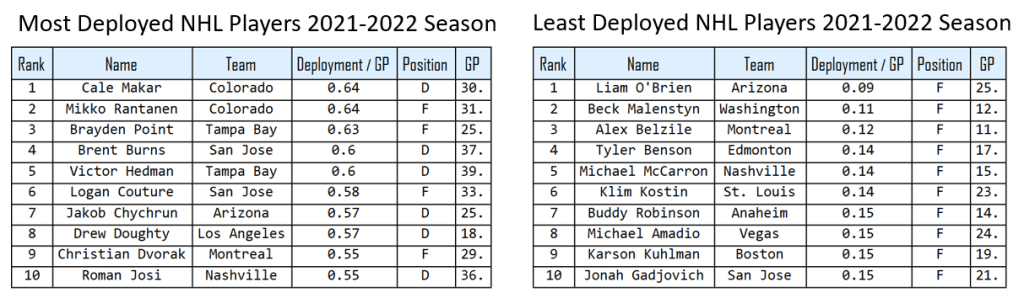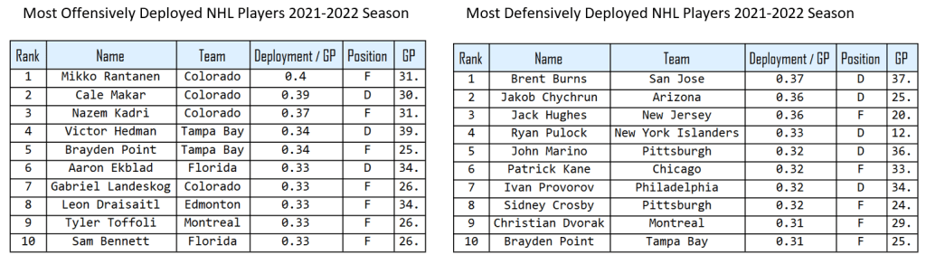 Furthermore, the deployment value of a player can vary whether on the Overall performance of the player, or the Offensive/Defensive performance. Based on the offensive or defensive zone deployments, or time spent on the power play or penalty kill, the deployment level of a player can differ between offence and defence for the same game. Bellow are the top NHL 2021-2022 Offensively and Defensively deployed players: