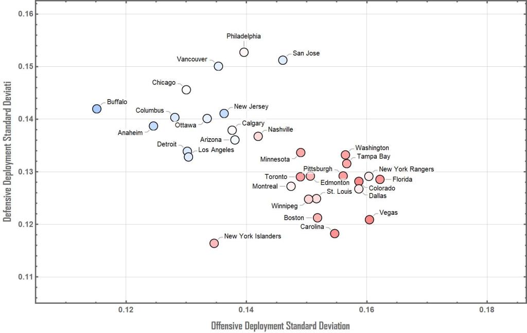 The following shows a map of all NHL teams for the 2021-2022 season on the Standard Deviation of the Offensive and Defensive Deployments. Furthermore, the data points present a colour code in function of the point % gained by the team. Red data points indicate positive point % teams whereas blue point indicate Negative point % teams.
