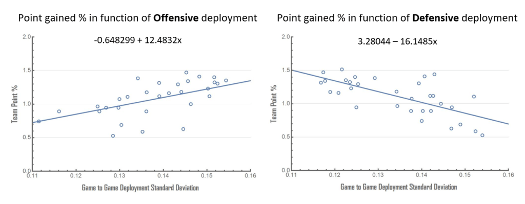 However on the defensive deployments, the opposite is true where teams defending by committee showed better game performance than teams relying on specific players to defend. In summary, on the offensive side, a larger spread in offensive deployments yields better results whereas defensively, defending by committee shows a better outcomes.