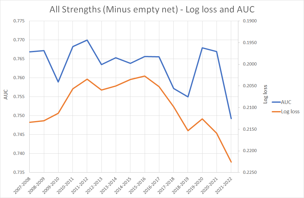 We see a trend where especially the log loss is getting worse and worse. This is probably not because the model is doing worse in the later seasons. It’s likely because teams are taking less low danger shots and more high danger shots. These are more difficult to predict and will therefore have a higher (worse) log loss.