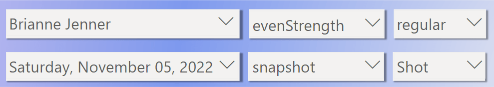 The top bar allows you to filter the shot data. You can filter by: Player, Strength state, Season stage (Playoffs or regular season), Date, Shot type and Shot event (Goal, Shot on net, Miss, Blocked shot).