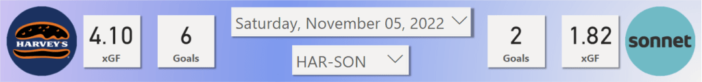 The first thing you do is to select a date and a game in the slicers at the top. The top bar also shows the goal and xG values for each team: