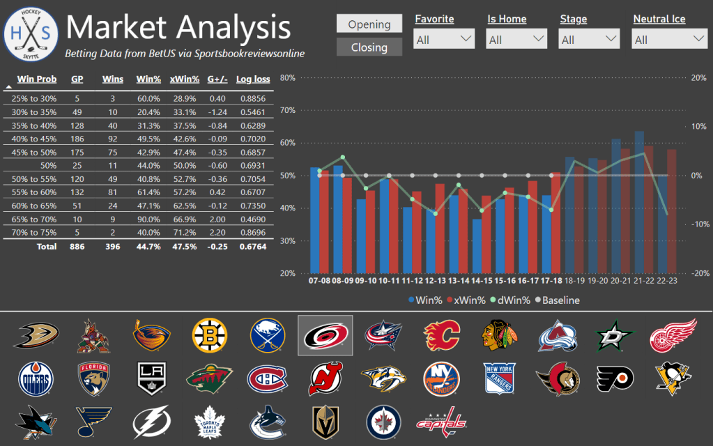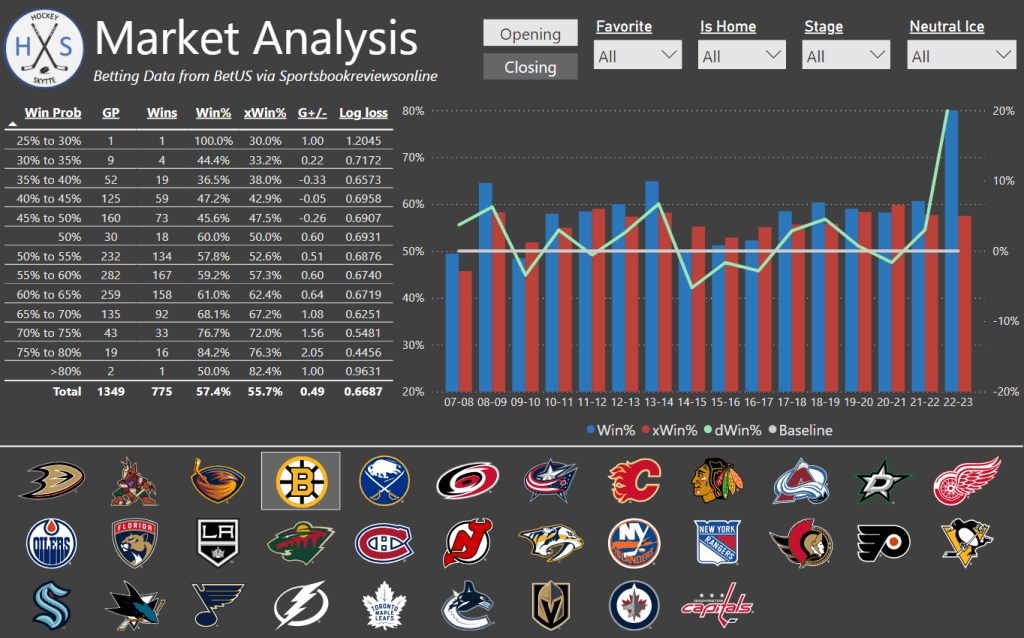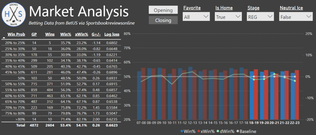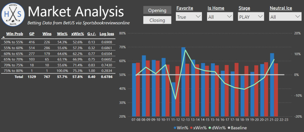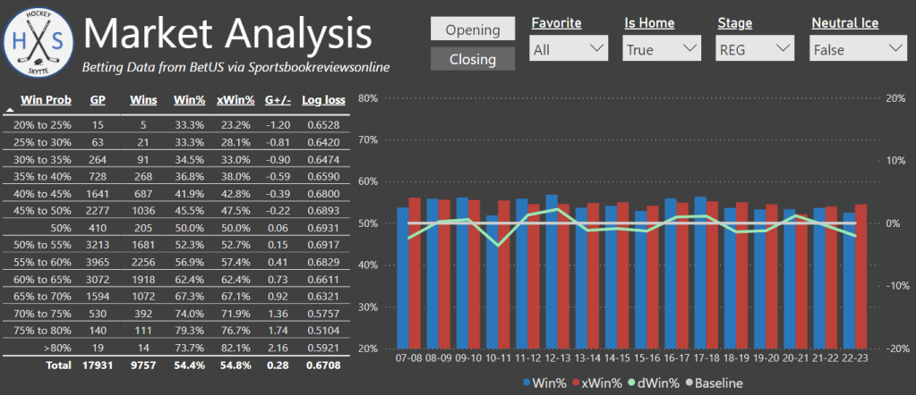 There’s no difference between the home ice advantage on opening odds and closing odds, so I will just look closing lines.