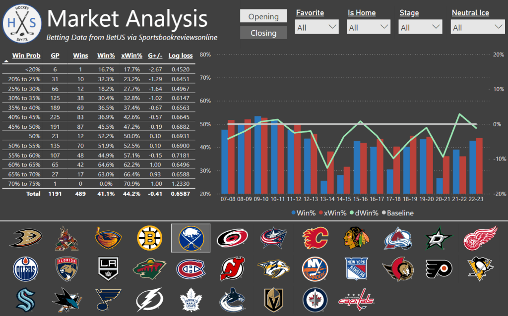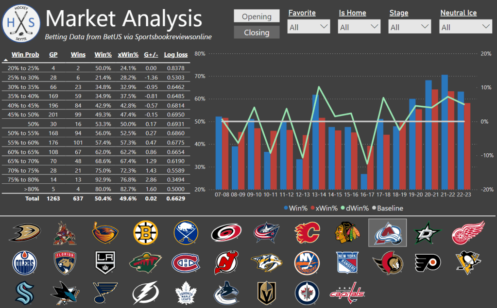 The average goal differential increases nicely with the xWin%, and the log loss decreases with increased xWin%. This is exactly what we would expect, and it shows that the opening market is well calibrated.