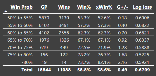 Generally, we see very little difference between expected win probability and the actual win percentage in all the bins except the “>80%” bin (but it’s only 4 games).
