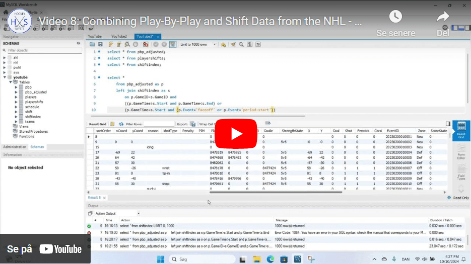 Every Wednesday I will upload a new video to YouTube. I will add the videos in this article as we go along. Schedule 2024-08-21: Getting data from the NHL Api based on date selection 2024-08-28: Scrape Shift data from the NHL HTML reports 2024-09-04: Get Play-by-Play and shift data for a full season at aContinue reading “Video Tutorial – Full Hockey Analytics Project”